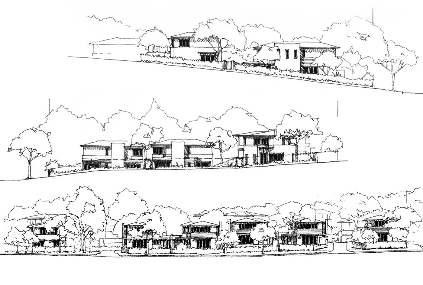Replacing six houses with fourteen dwellings in a suburban setting for the Defence Housing Authority potentially raised community issues. By using the topography and detaching and articulating dwellings on the high side of the site, view and sunlight amenities to neighbours was maintained. The central village-green element provided a focal point, play areas and contributed to the stormwater management.
